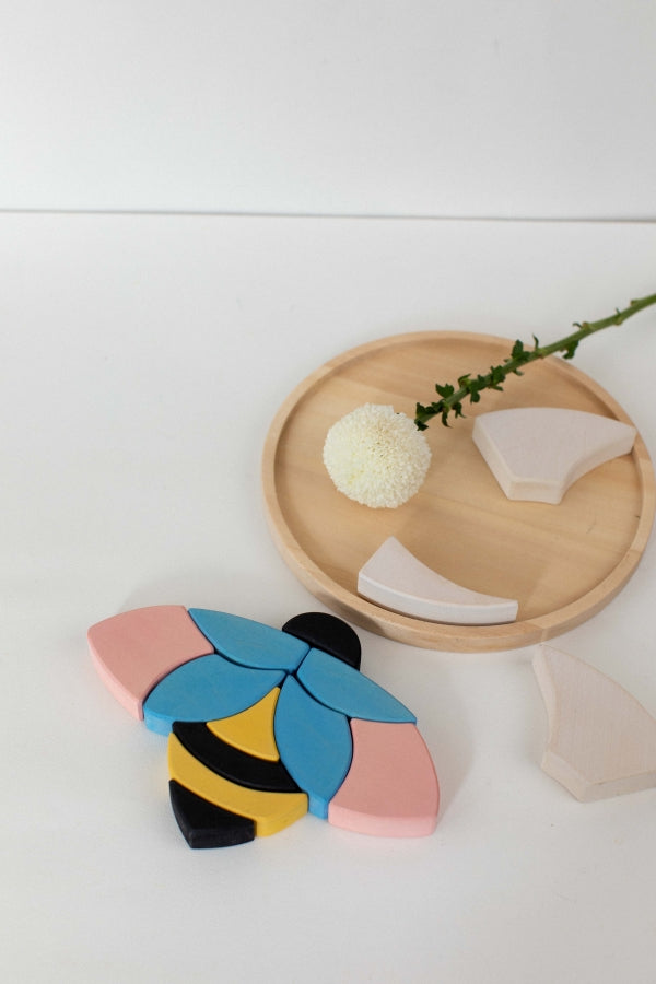This cute bee puzzle can be used in so many ways! From playing it as a puzzle itself to using it as a building blocks to even imaginary play; the play is infinite! Check out the photos for some inspiration but we believe more can be created from this set itself.