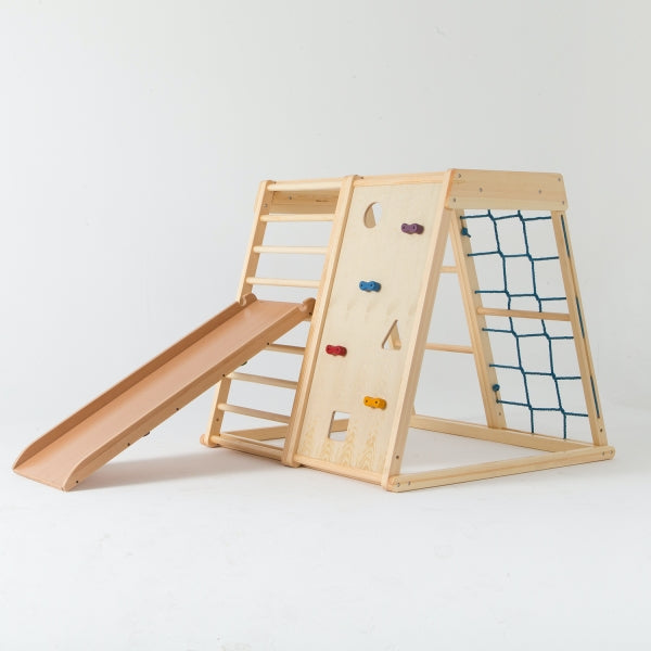 This set comes with a double sided slide, wooden swing and wooden ring.
