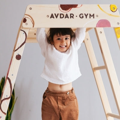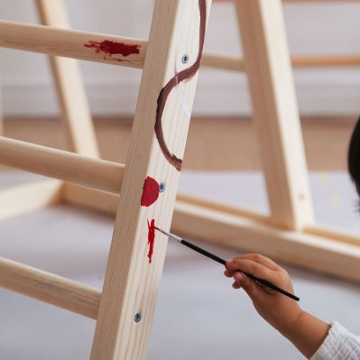 This DIY Trapets Gym has an uncoated surface so that your child can draw and paint on them, an open-ended space to express their artistic freedom. Just like the classic trapets gym, your child will be able to develop fine motor skills and gross motor skills as they approach new climbing challenges and routes.
