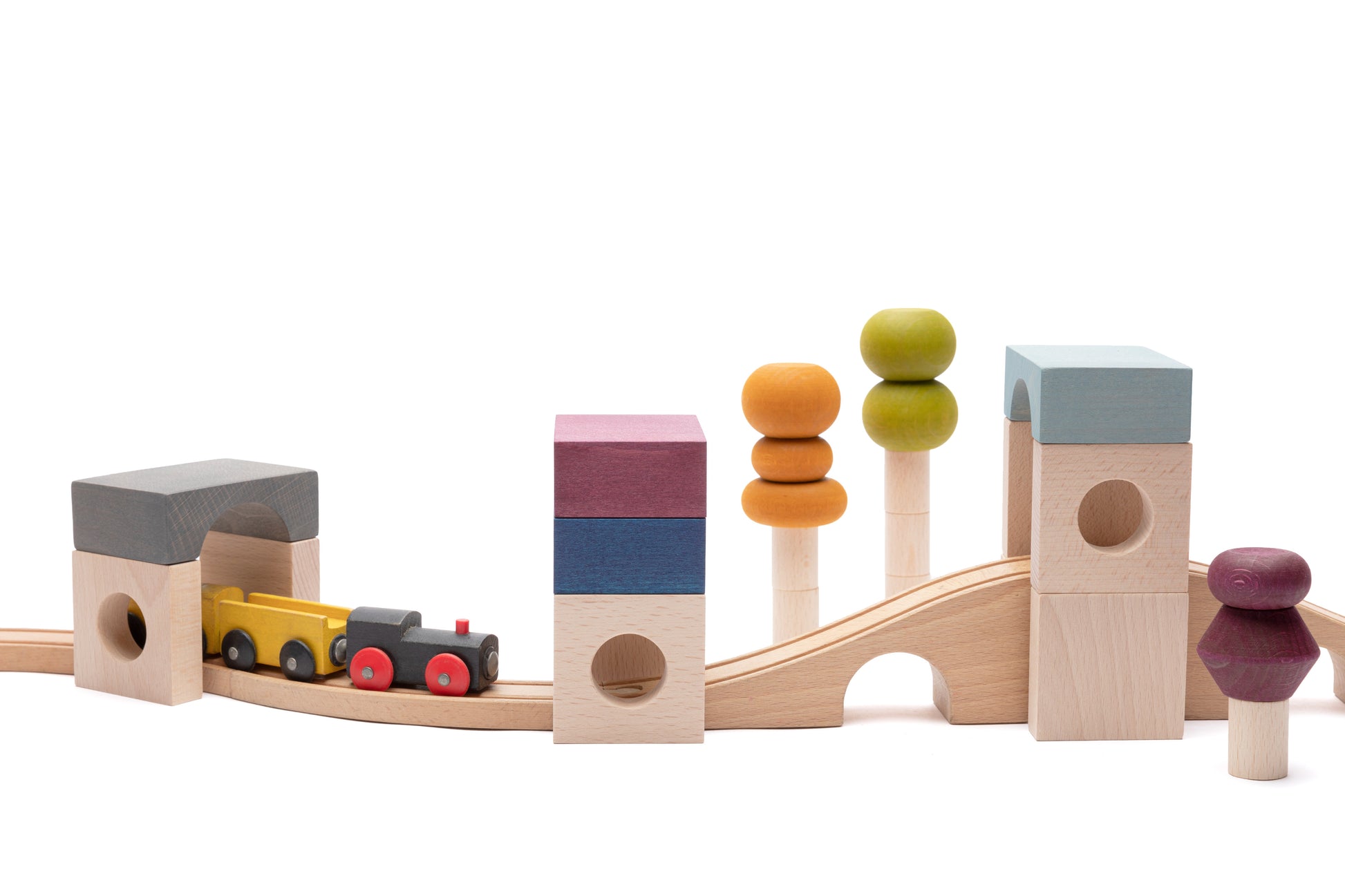 This construction set comes with four tunnel-shaped blocks and 8 square wall pieces, all made of high quality solid beech wood. A perfect add-on to any wooden railway set. Of course you can create so much more than just tunnels with these blocks, such as buildings, garages, bus stops etc.. The Tetuan Medium Pack includes unpainted natural wall pieces as well as tunnel-shaped blocks in dark blue, grey, plum and light grey-blue.