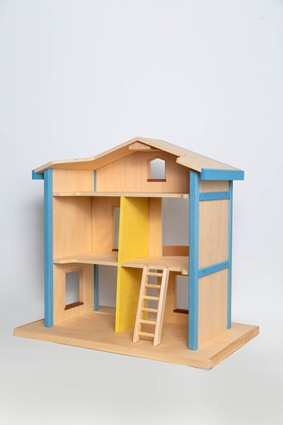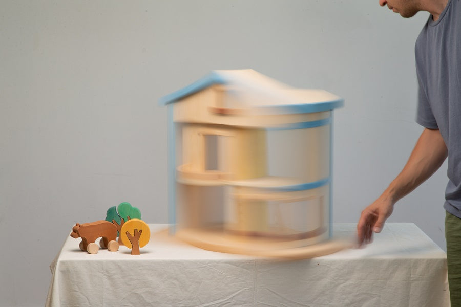 Expertly handcrafted in the AVDAR workshop, the Twirl Around Dollhouse boasts meticulous attention to detail. It features two stories and an attic, with four spacious rooms and a charming balcony. The innovative spinning platform, along with sliding doors and a small ladder, adds a dynamic touch to the design. Each floor of the dollhouse varies in width, from smaller rooms at the top to larger spaces on the lower levels, allowing for simultaneous play across all three levels.