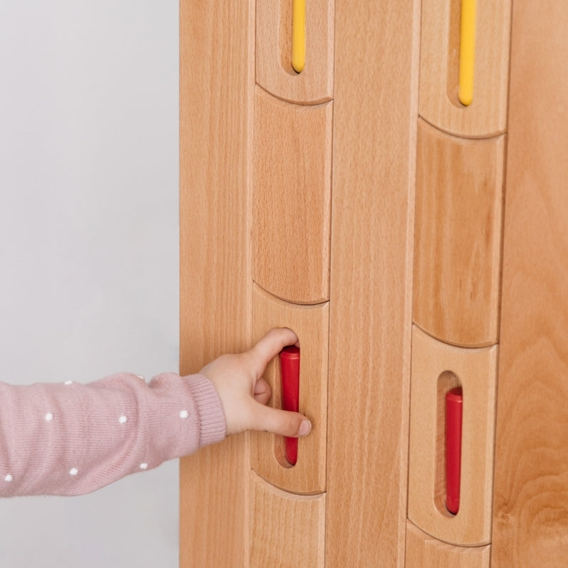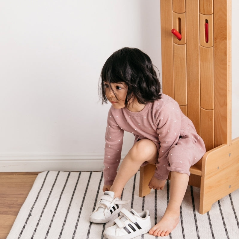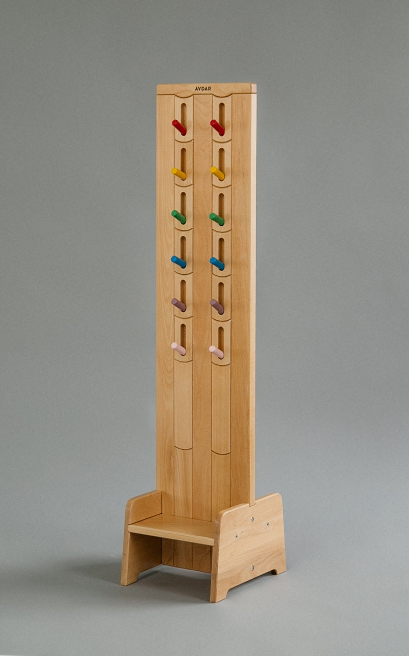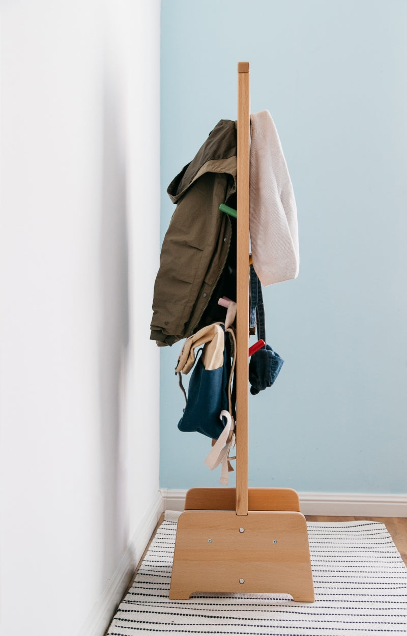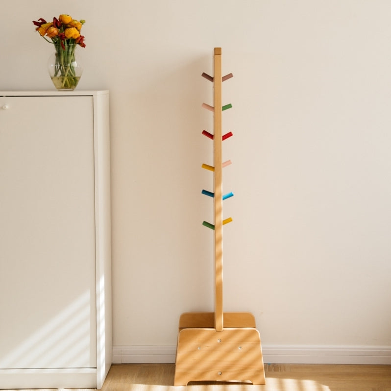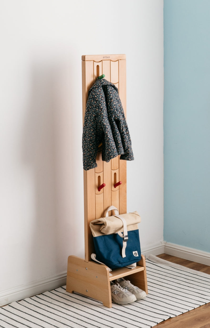 The Rainbow Rack also comes with a seating area for a child to be seated as they put their shoes on, which doubles as a shoe rack. It is made of Beechwood and covered with non-toxic water-based eco-friendly paint.
