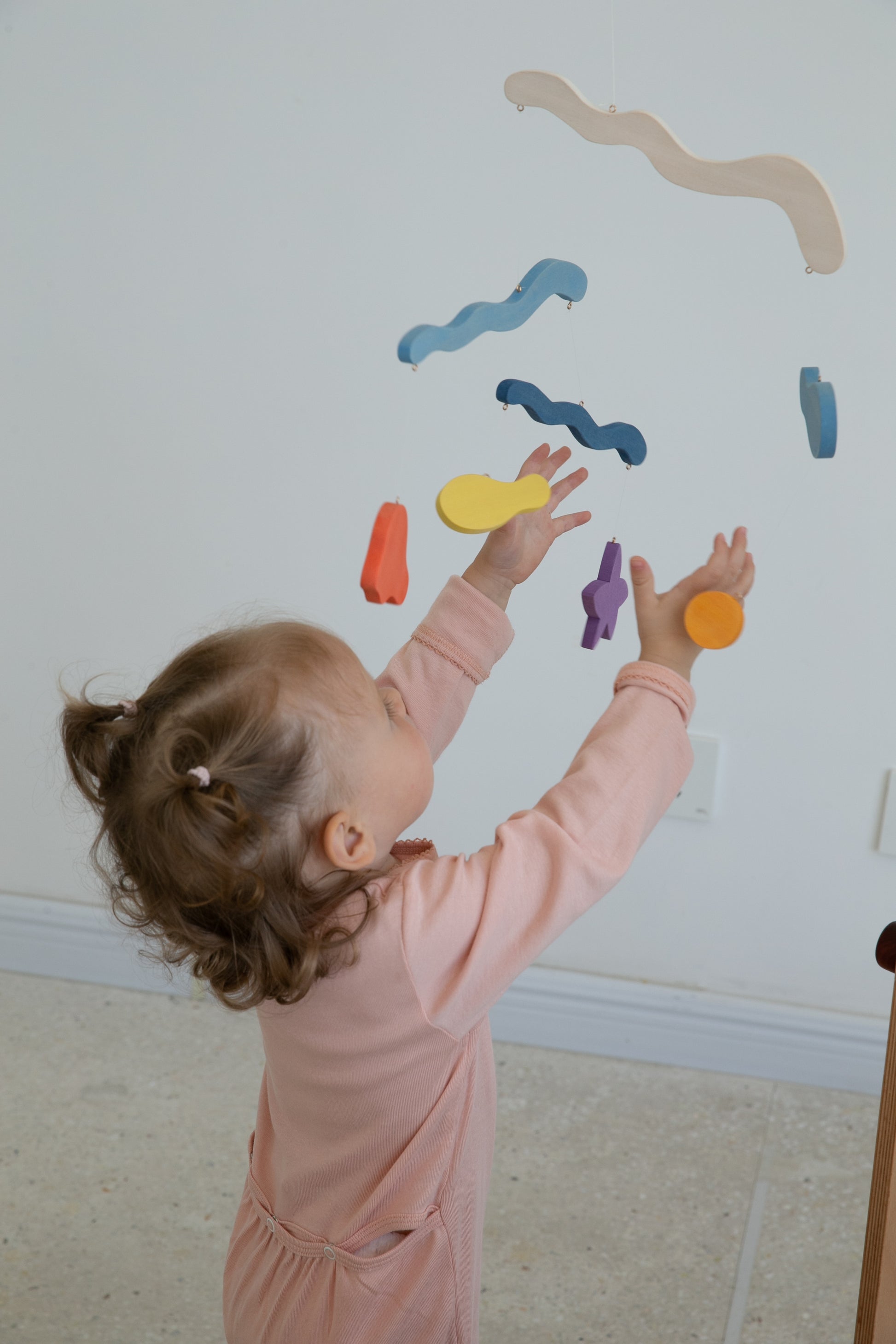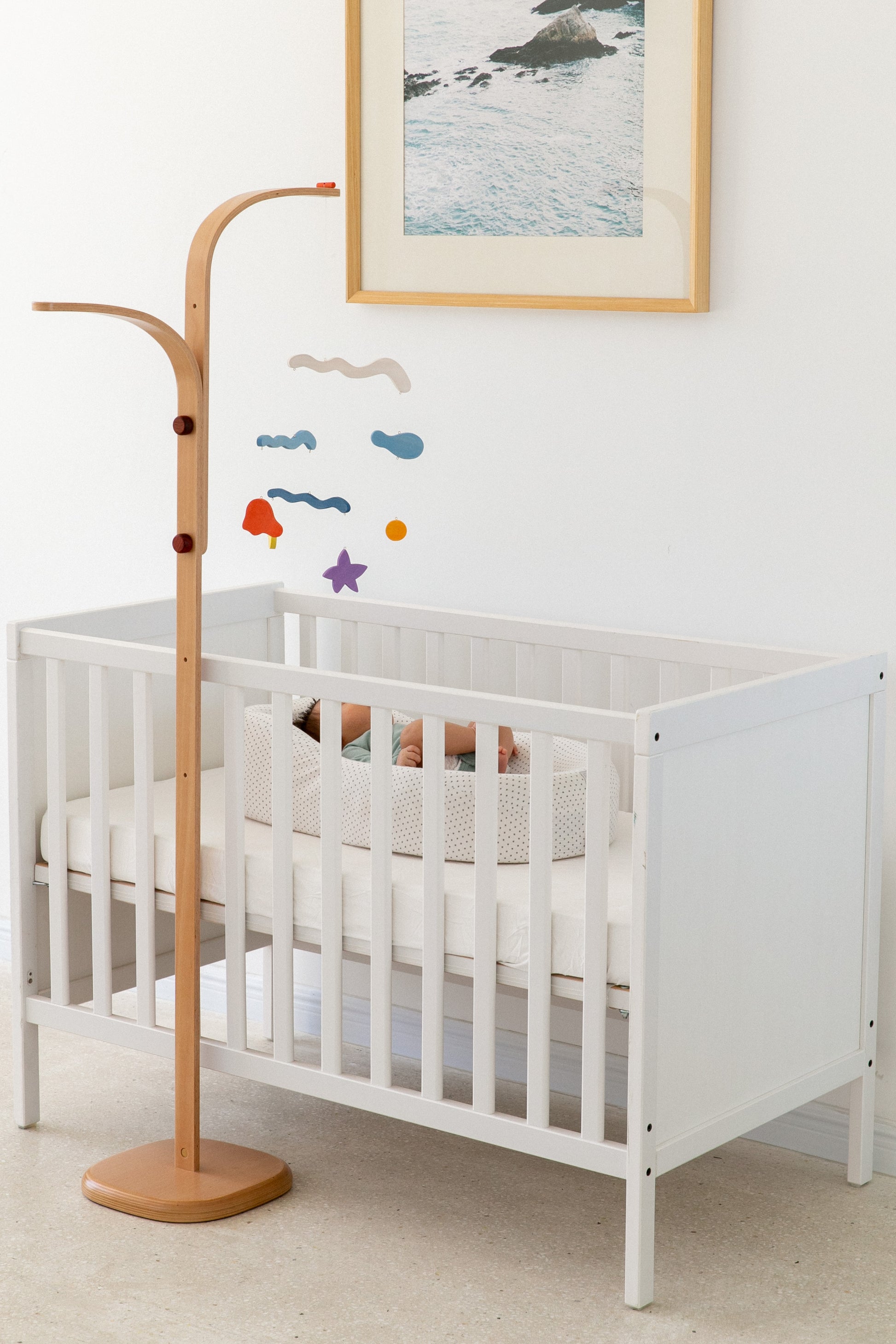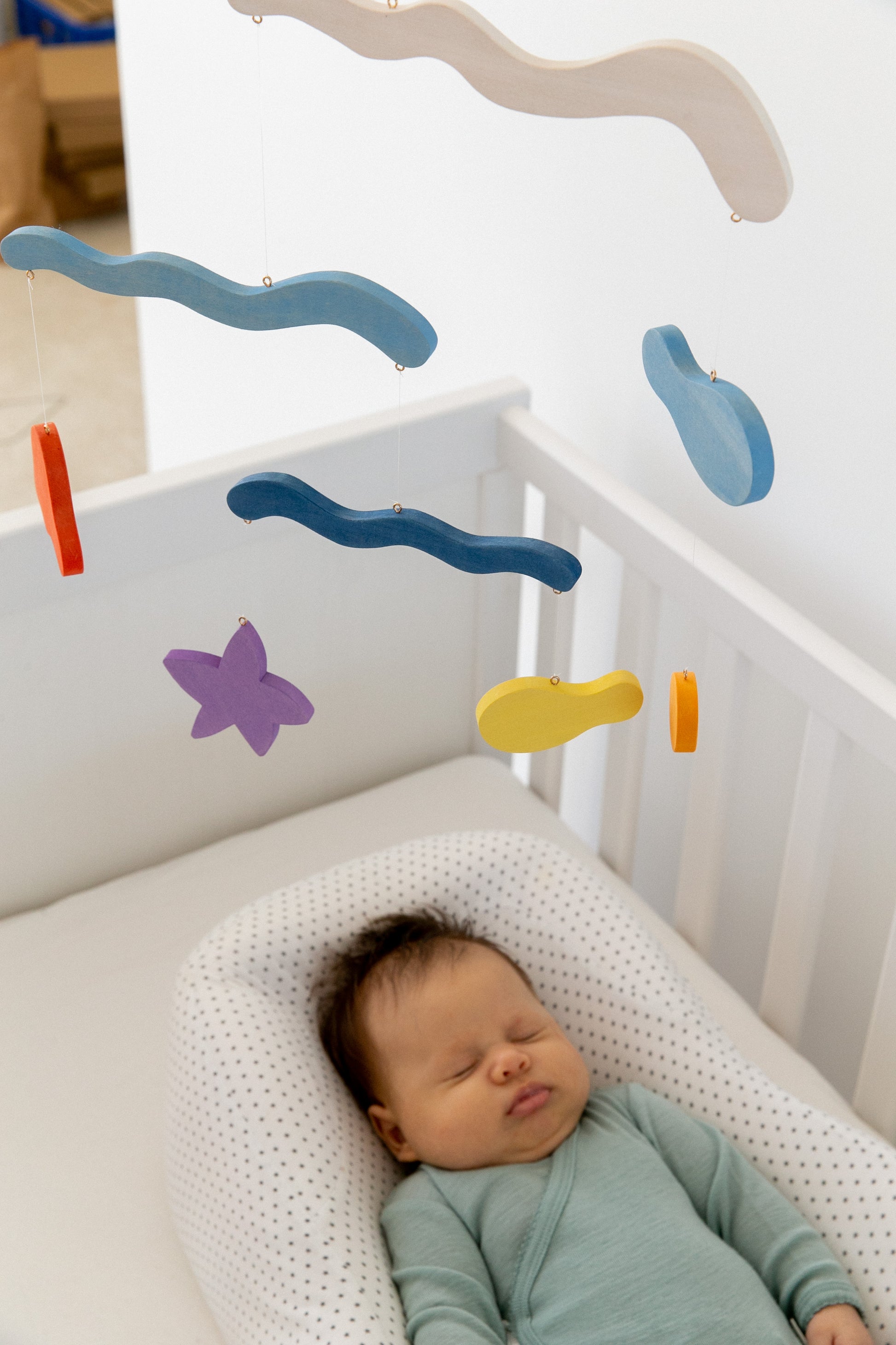 A mobile can help provide visual stimulation to your baby at a young age. A mobile also helps with physical development, as they grow and learn to judge distances and spatial awareness. As they develop the skills to reach out for items, the mobile can assist in hand-eye coordination training.