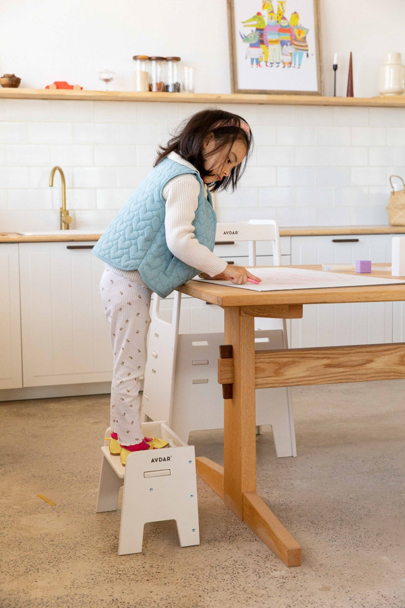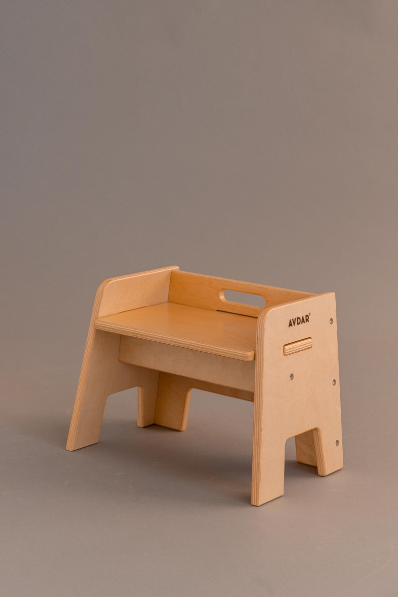 Reinforced with bottom support bars, it can bear up to 70 kilograms. Smooth rounded edges ensure safety and comfort. A versatile seat and step stool for various situations.