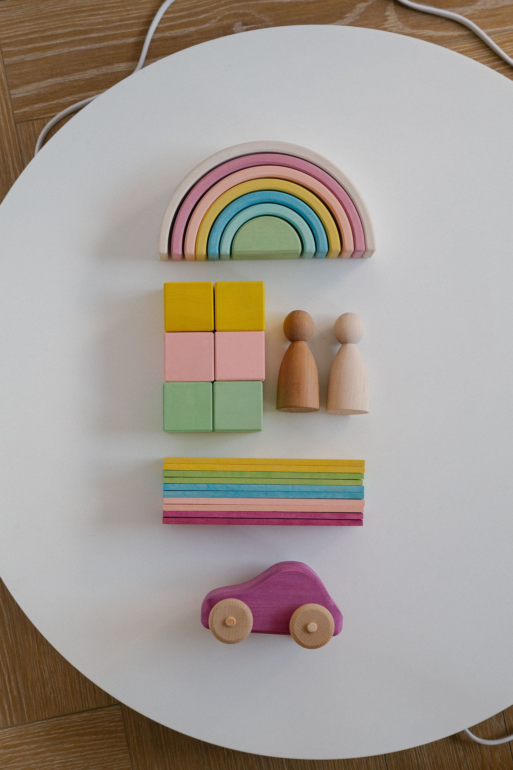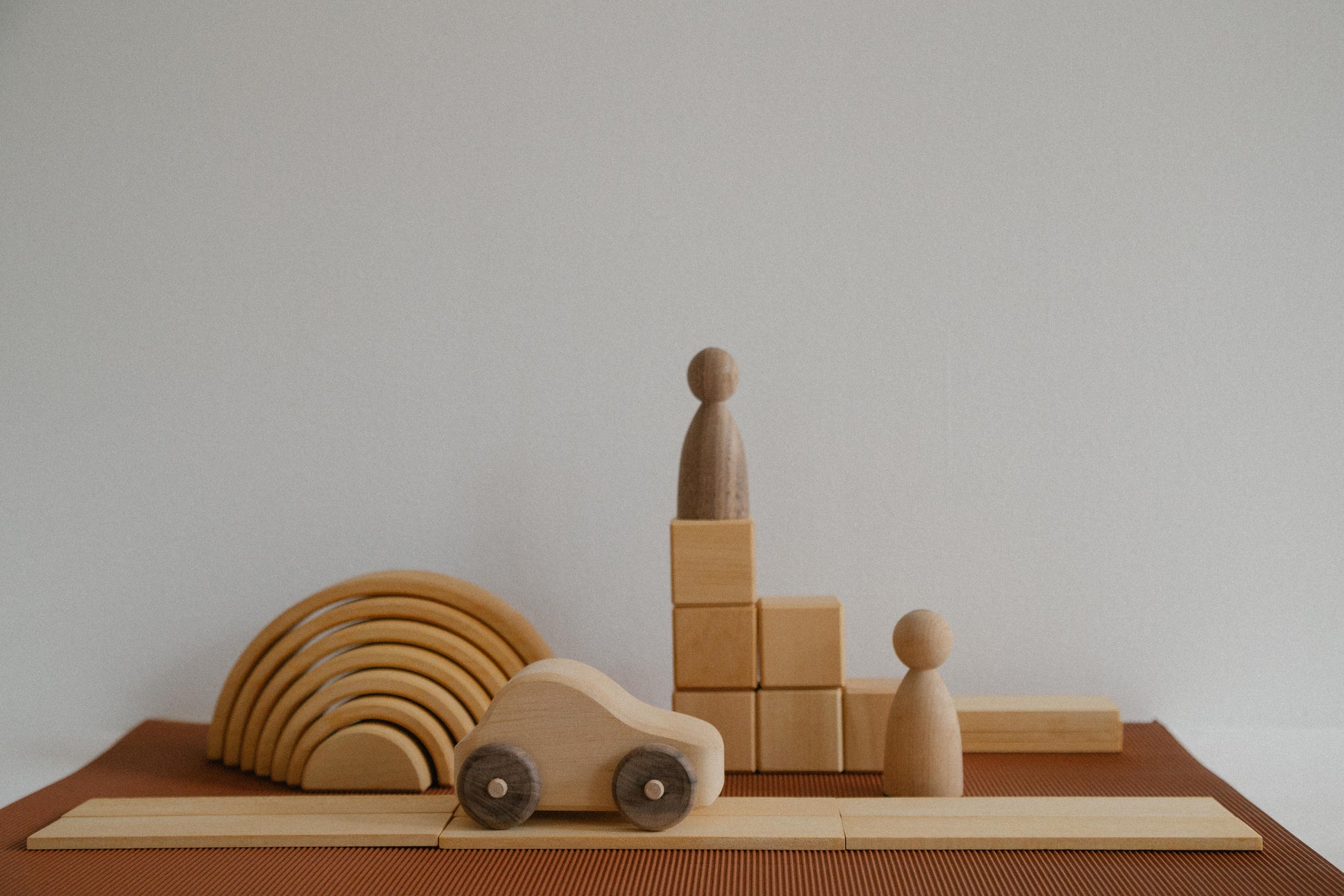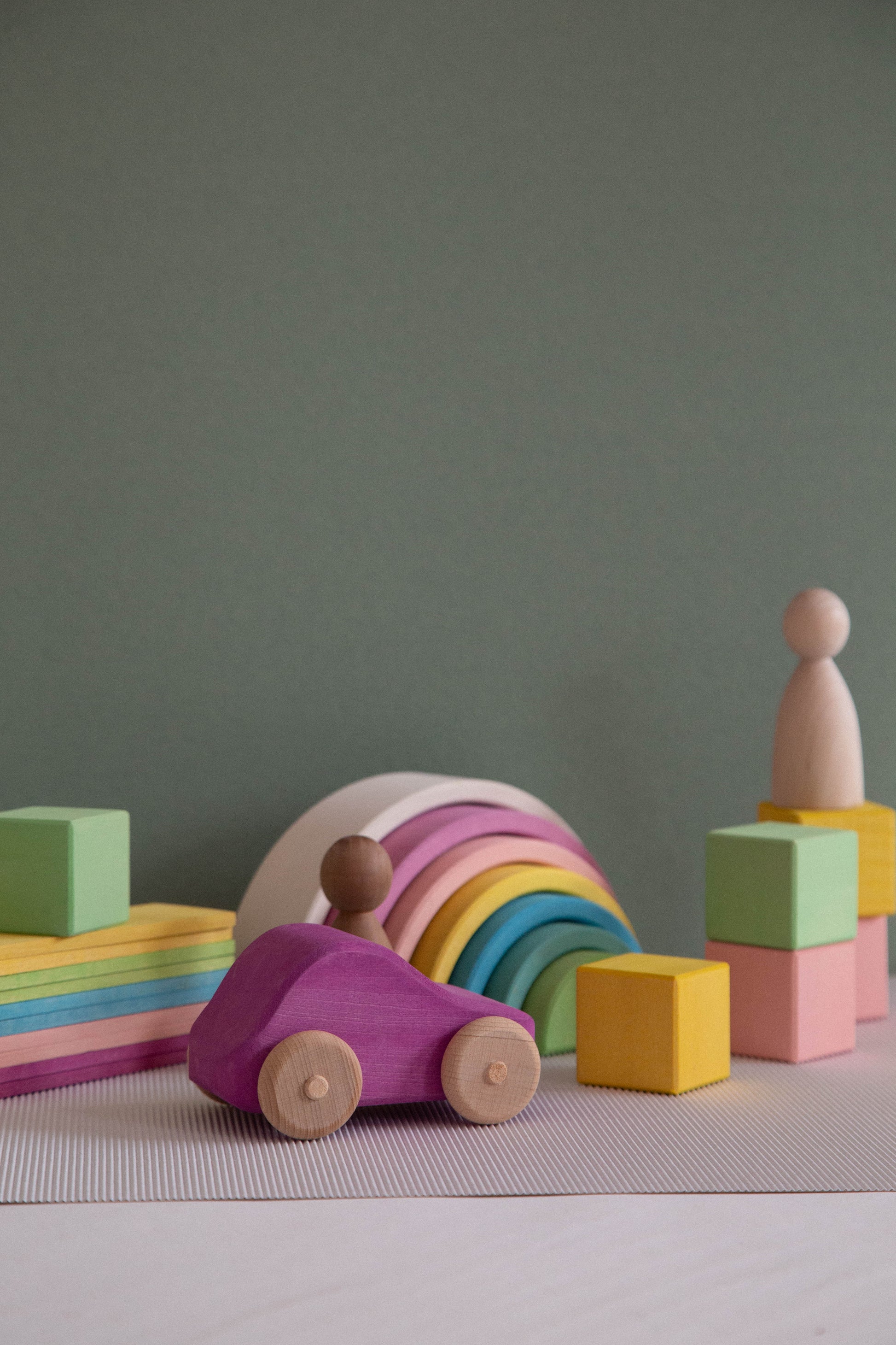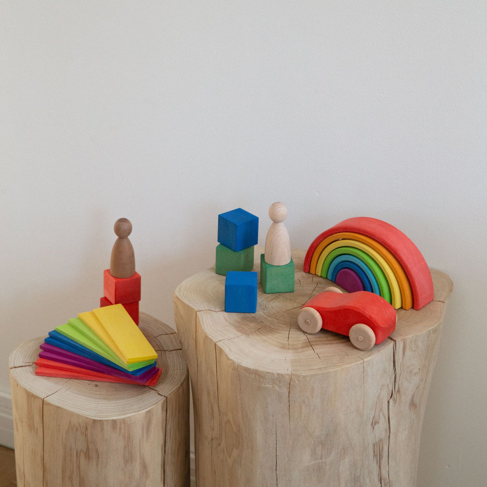 This set includes 1 small rainbow, 6 blocks, 6 flat blocks, 2 peg dolls, 1 wooden car/camera and it comes with a linen bag.